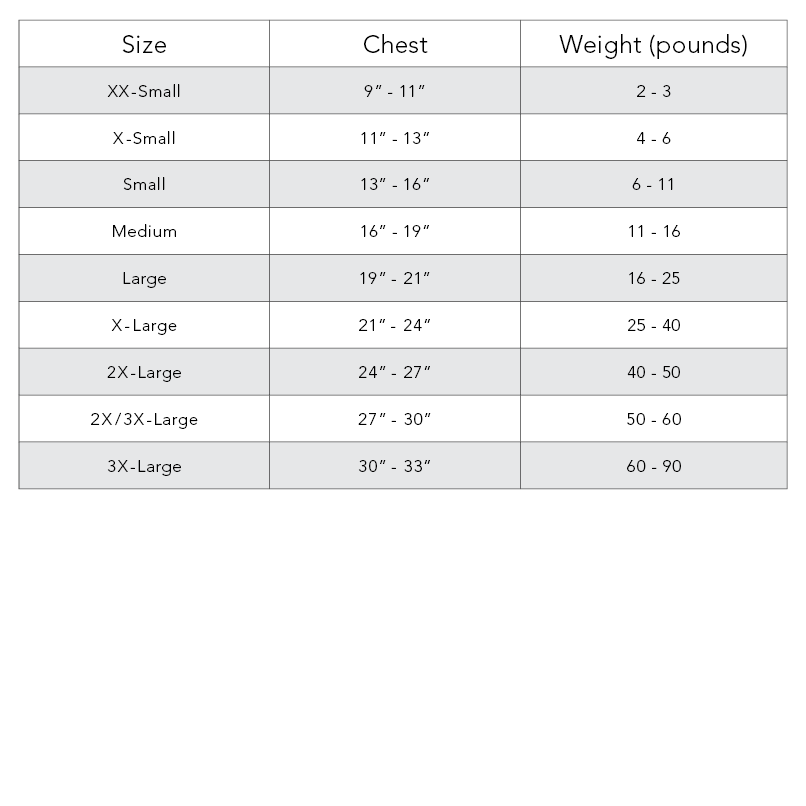 Important Sizing Note: The following measurements are the dimensions of the actual product, not of the pet they fit. After measuring your pet, make sure all measurements fit within the following dimensions (with a little room to spare in the chest and neck).