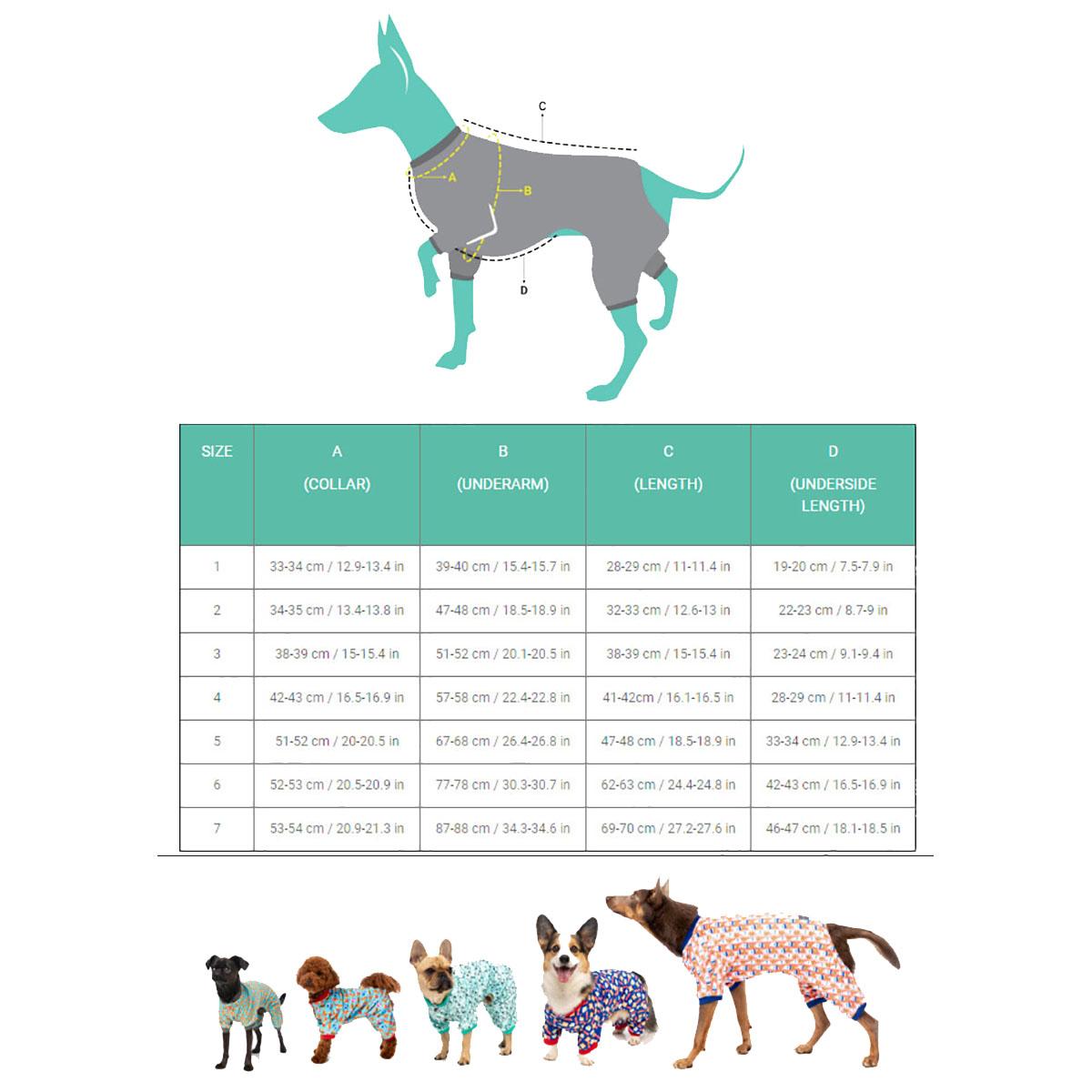 Size 1: Chest 15.4-15.7" Neck 12.9-13.4" Under Length 7.5-7.9" Back Length 11-11.4"