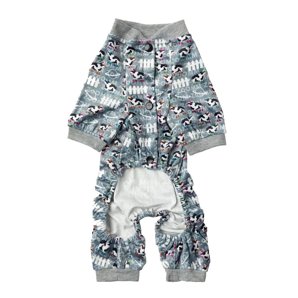 The FuzzYard Cosmic Cows Dog Pajamas will have your pup on an adorable out-of-this-world adventure! The sensible design of these dog pajamas makes them easy for your dog to wear. Keep your pup warm and help keep pet hair and dander off of sleeping surfaces. This is especially helpful if your pet sleeps with you. This dog sleepwear also provides full coverage to limit a pet's ability to bite and scratch themselves. This can allow dogs with allergies or injuries to heal. Made of 100% polyester. Wash with similar colors. Wash inside out. Do not soak. Do not iron.