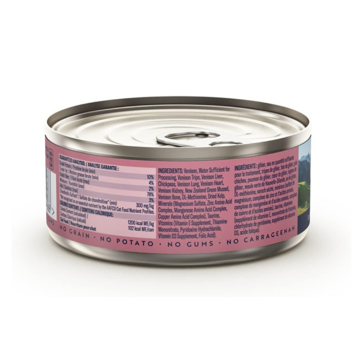 Venison, Water Sufficient for Processing, Venison Tripe, Venison Liver, Chickpeas, Venison Lung, Venison Heart, Venison Kidney, New Zealand Green Mussel, Venison Bone, DL-Methionine, Dried Kelp, Minerals (Magnesium Sulfate, Zinc Amino Acid Complex, Manganese Amino Acid Complex, Copper Amino Acid Complex), Taurine, Vitamins (Vitamin E Supplement, Thiamine Mononitrate, Pyridoxine Hydrochloride, Vitamin D3 Supplement, Folic Acid).